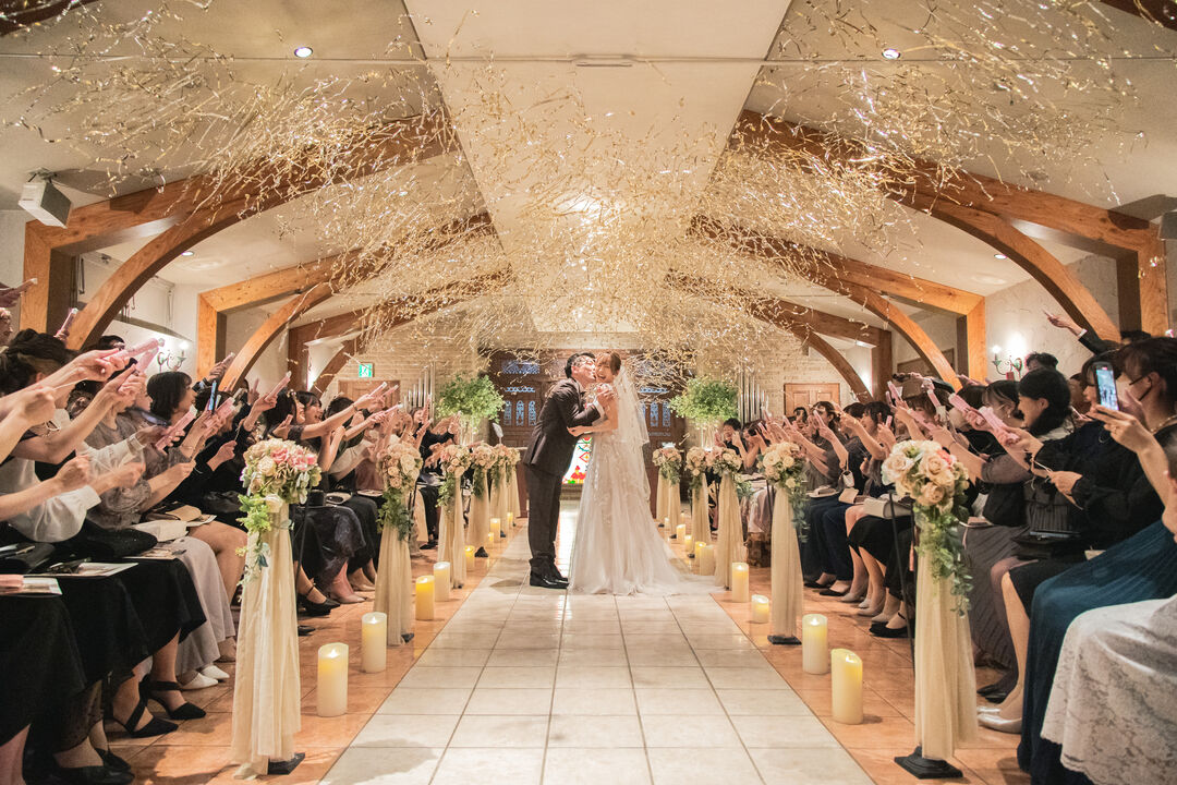 - ディアズ水戸スパニッシュガーデンさんのチャペルは天井が低く、一人一人が近くに感じられるところも他にはない素敵なところだと思っています。その雰囲気を活かしつつ、さらに私達と皆様とでひとつになりたい、皆様に見守っていただきたいという想いもあり、皆様の前に出るのではなく皆様の真ん中で指輪の交換から誓いのキスまで行わせていただき、皆様にクラッカーを鳴らしていただきました。なかなか無いシチュエーションだと思うので、実行させていただけたこと、とても感謝しています。ご支援のおかげでとても素敵な写真も撮っていただけて、大満足です!